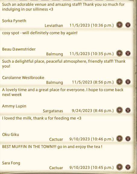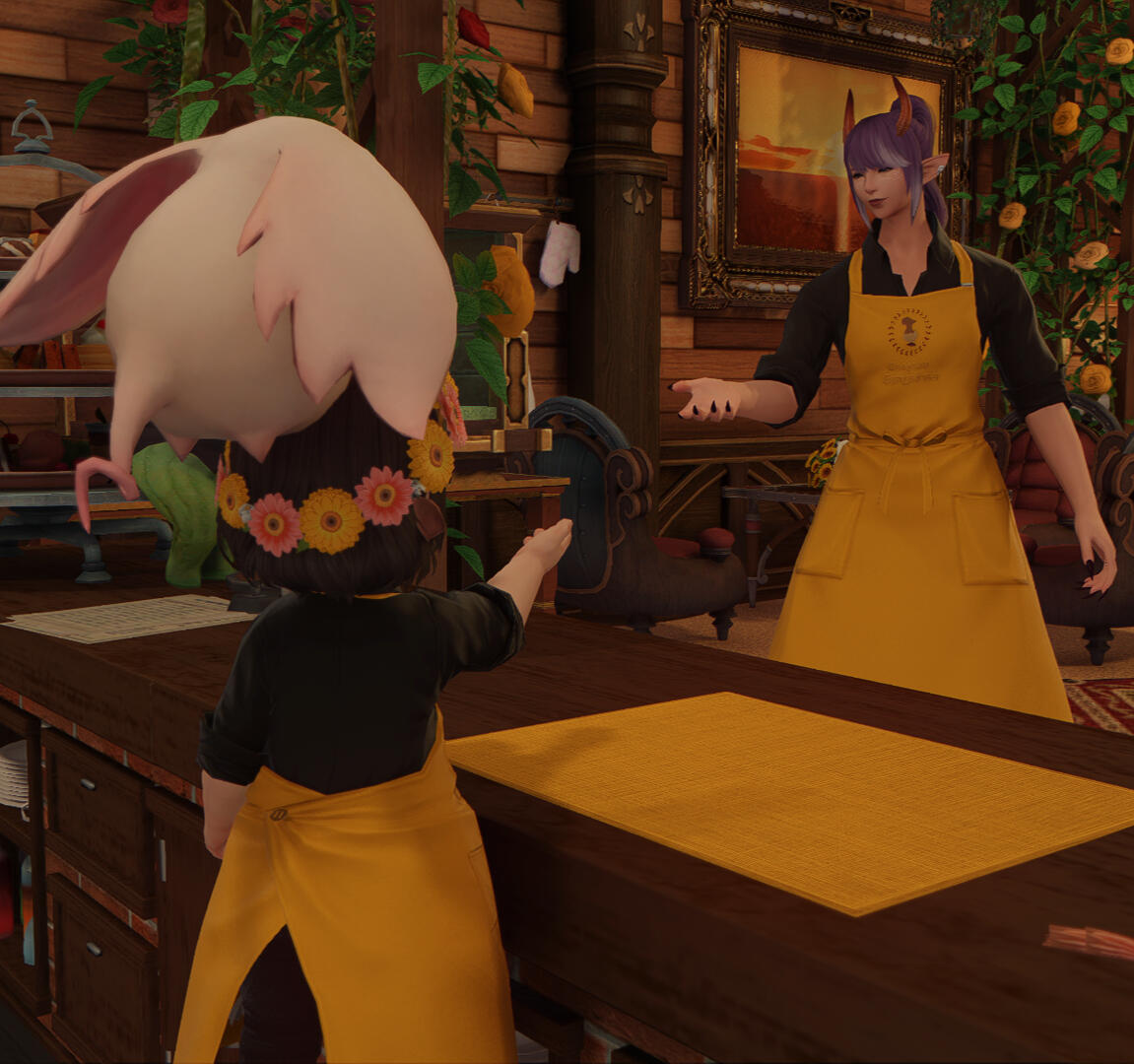 Welcome to Sunnyside Uppies!Founded in Sixth Astral Era, This Brunch Cafe is one of Eorzea's First. Our goal is to offer many Adventurers a place to rest and eat after their long outings and journeys. Serving a range of sustenance and refreshments sourced from the finest suppliers in The Holy See of Ishgard.We have some of the finest and most experienced staff you could ever find in the whole of Eorzea. They're very outgoing and love starting conversations with our patrons.