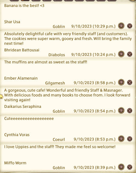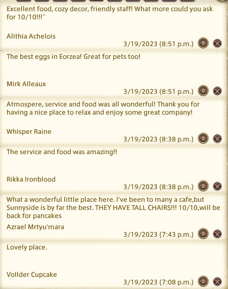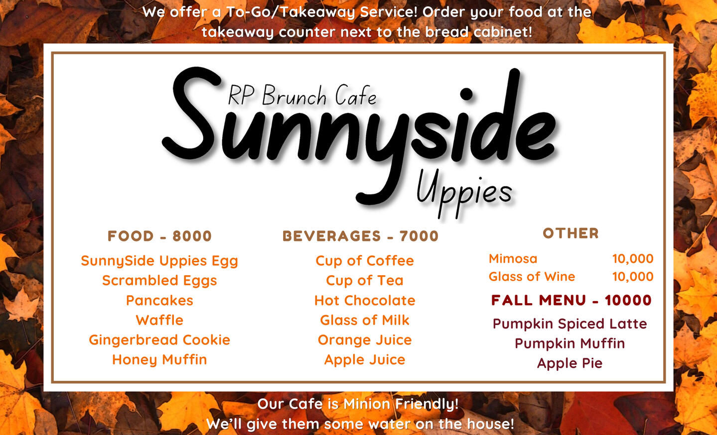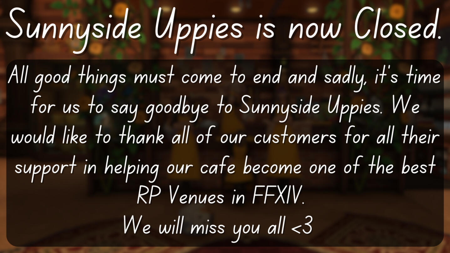 Welcome to Sunnyside Uppies!Founded in Sixth Astral Era, This Brunch Cafe is one of Eorzea's First. Our goal is to offer many Adventurers a place to rest and eat after their long outings and journeys. Serving a range of sustenance and refreshments sourced from the finest suppliers in The Holy See of Ishgard.We have some of the finest and most experienced staff you could ever find in the whole of Eorzea. They're very outgoing and love starting conversations with our patrons.